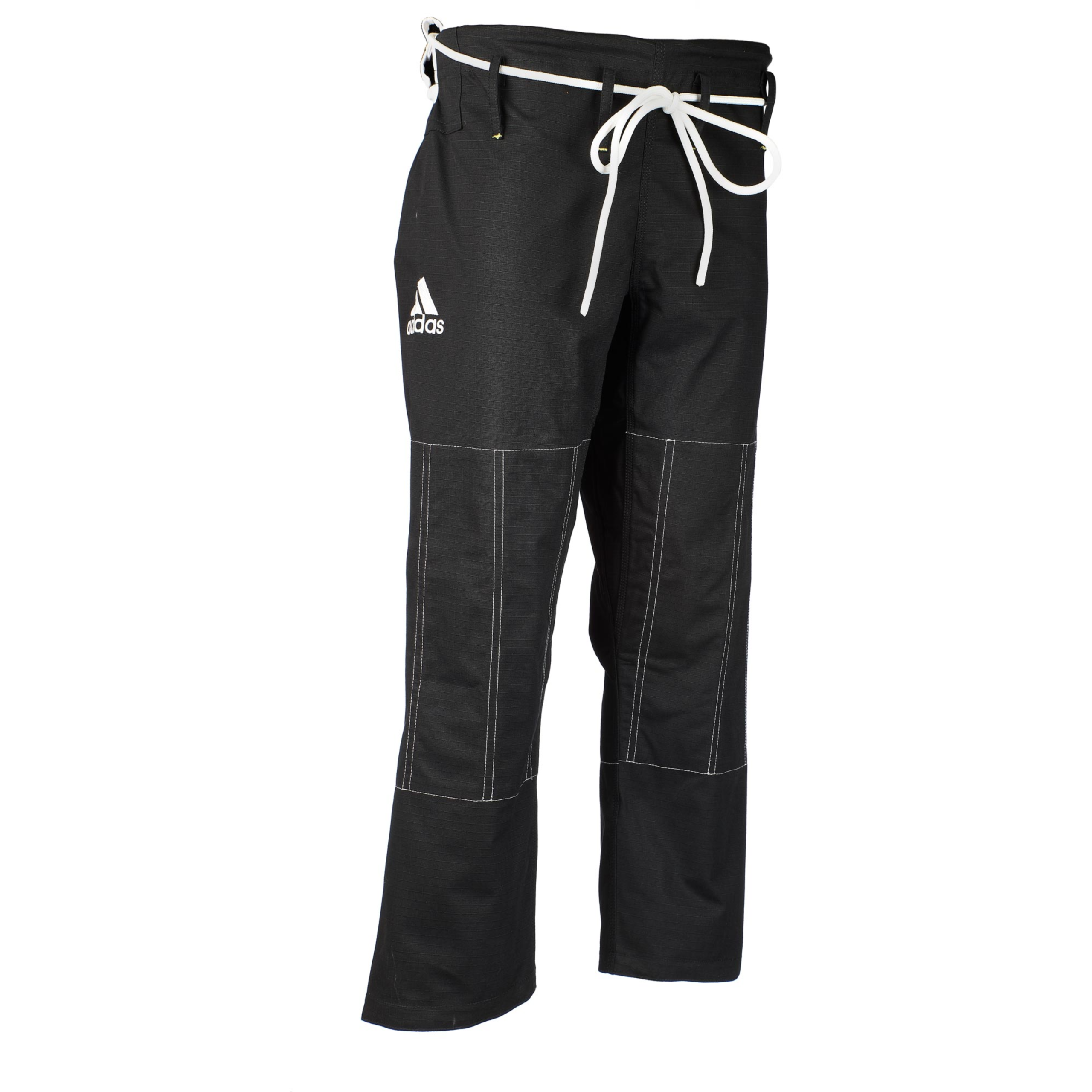 The sleek black and white design with embroidered Adidas logos reflects strength and confidence, while reinforced stitching and knee padding ensure lasting performance under the toughest conditions.