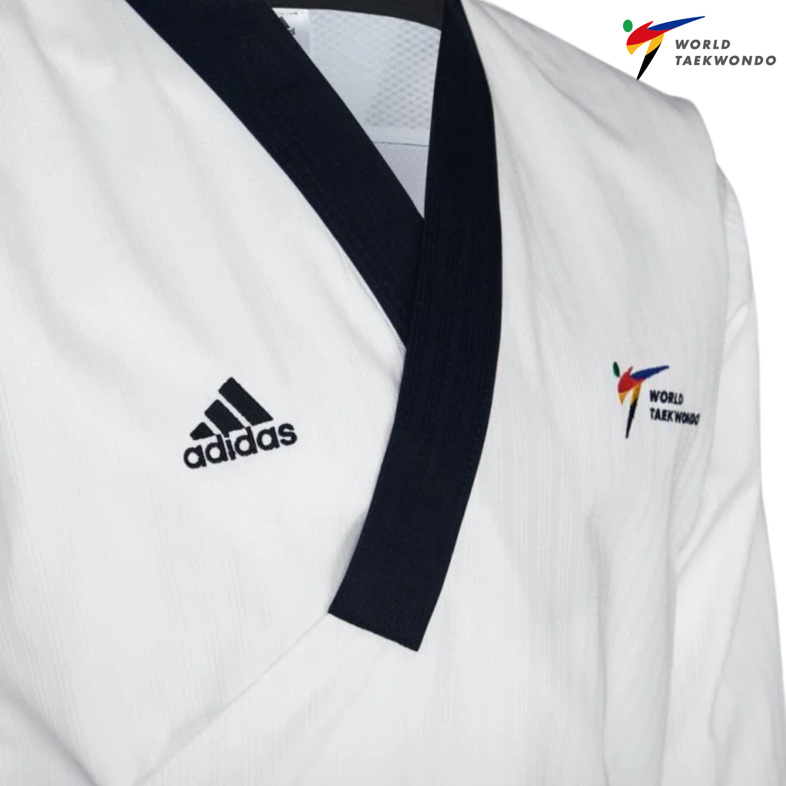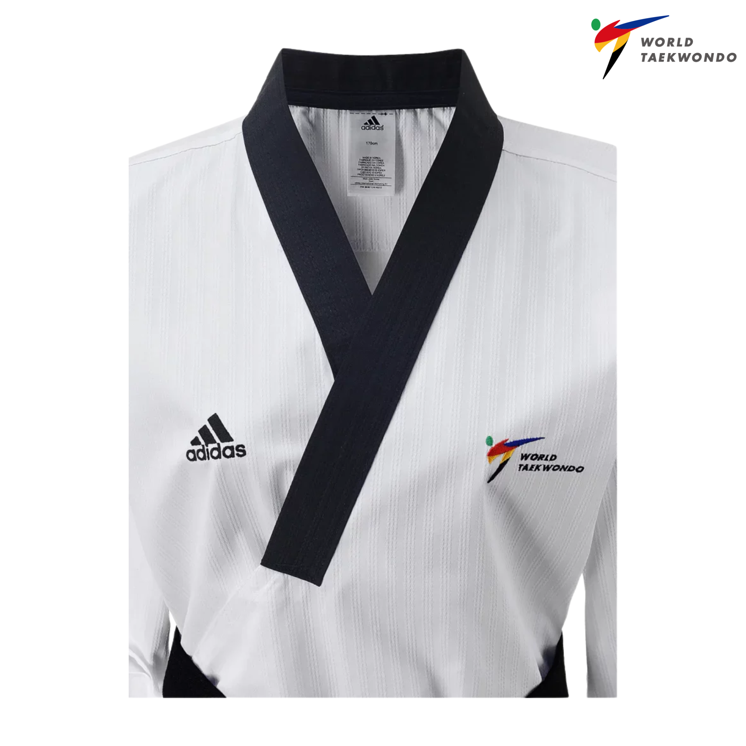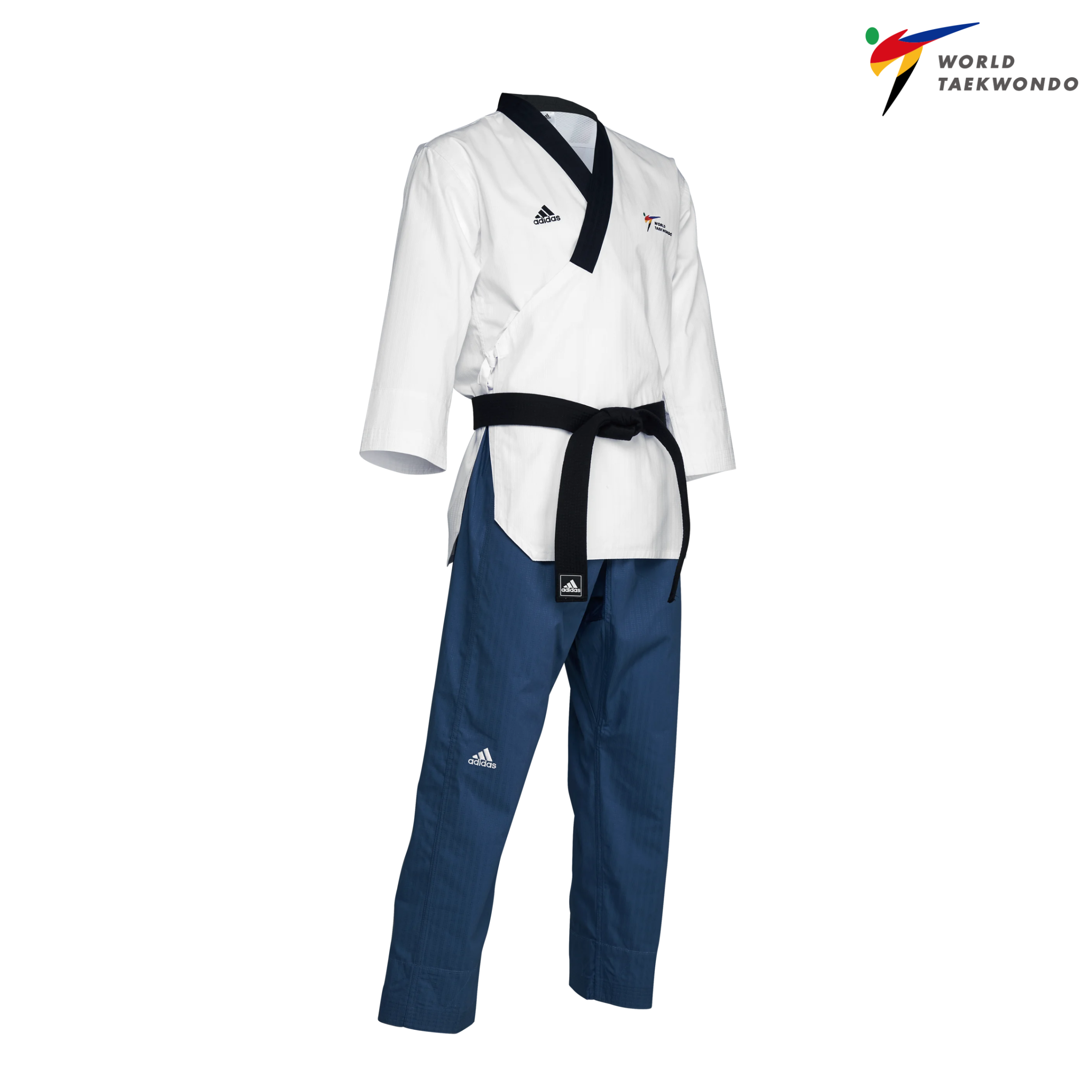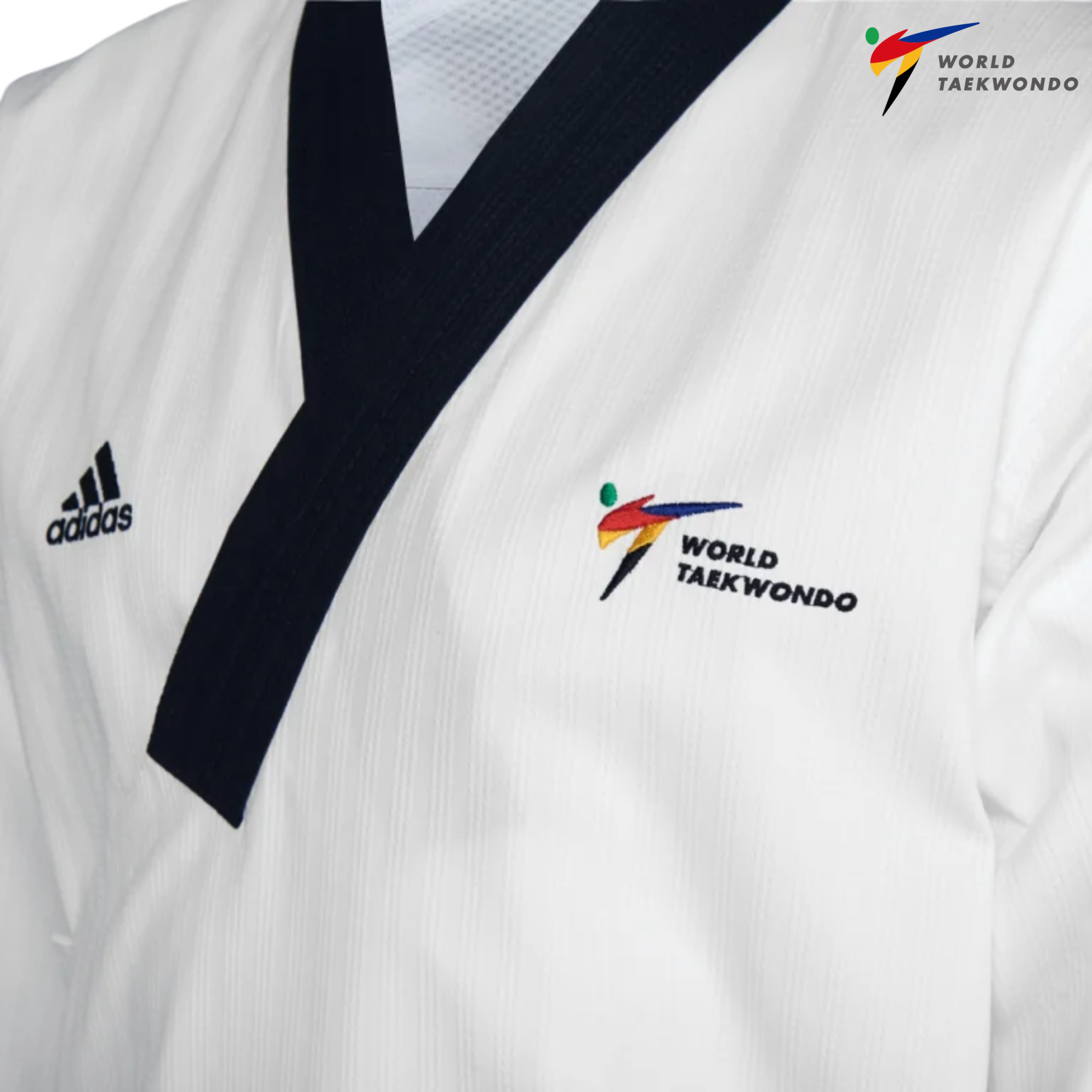 Pakaian Seragam Taekwondo Adidas WT ADI-Poomsae Adult Female diperbuat daripada campuran 55% kapas, 45% poliester untuk ketahanan dan keselesaan. Direka mengikut peraturan rasmi WT, ia menampilkan pakaian seragam leher V hitam dengan bukaan hadapan. Seluar dilengkapi pinggang elastik dan tali serut tambahan untuk kesesuaian yang ketat. Fabrik berstruktur meningkatkan prestasi teknikal, dengan logo sulaman Adidas dan WT menambah sentuhan premium.