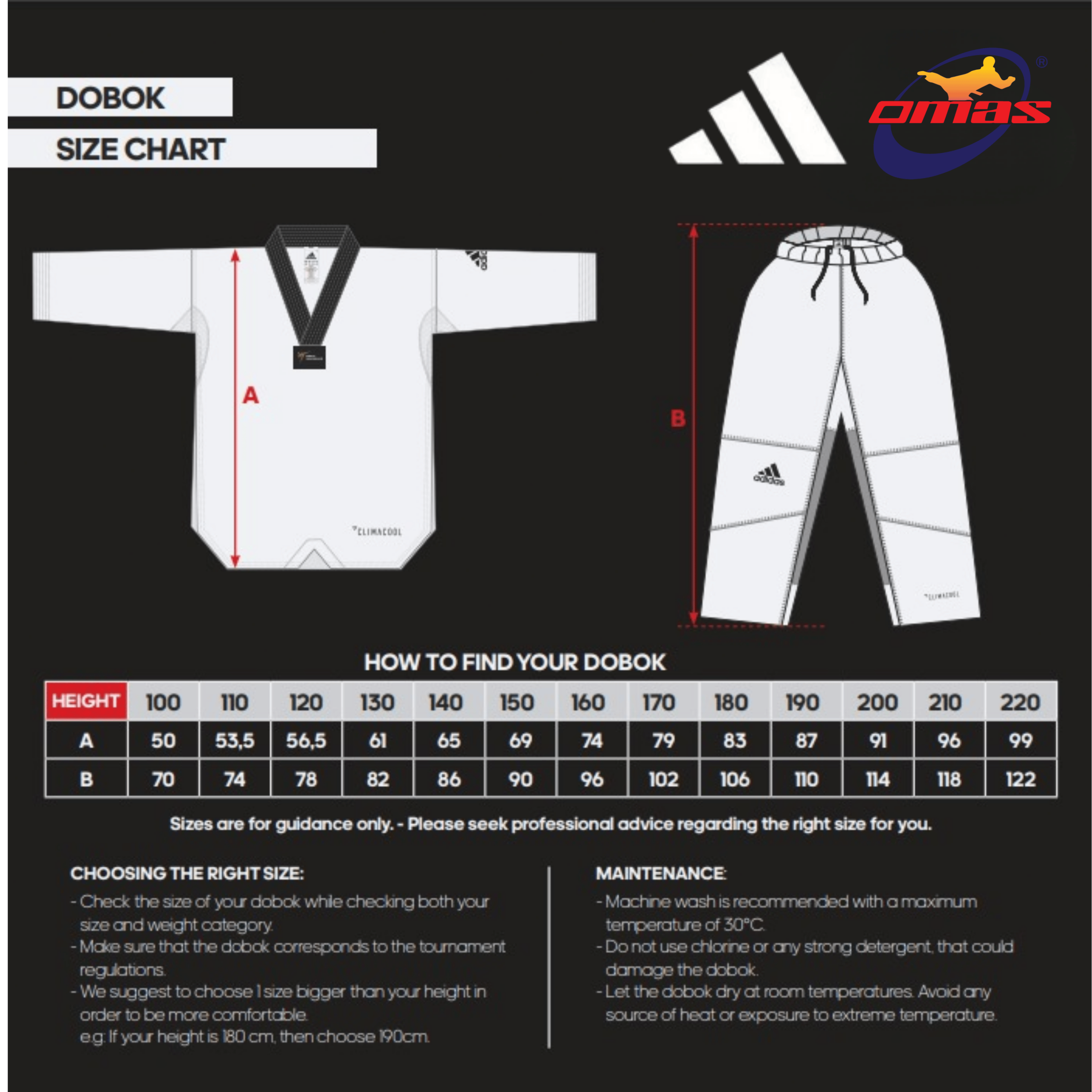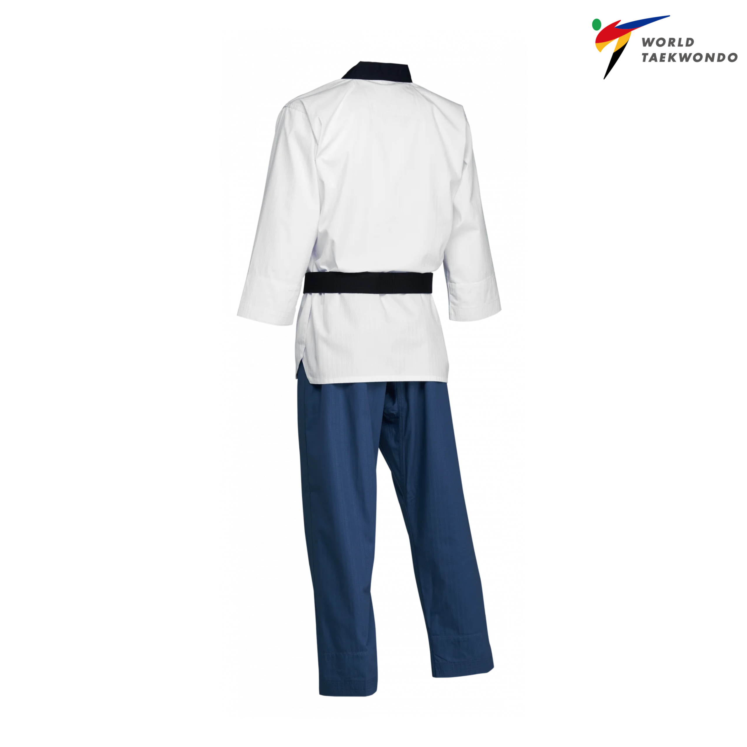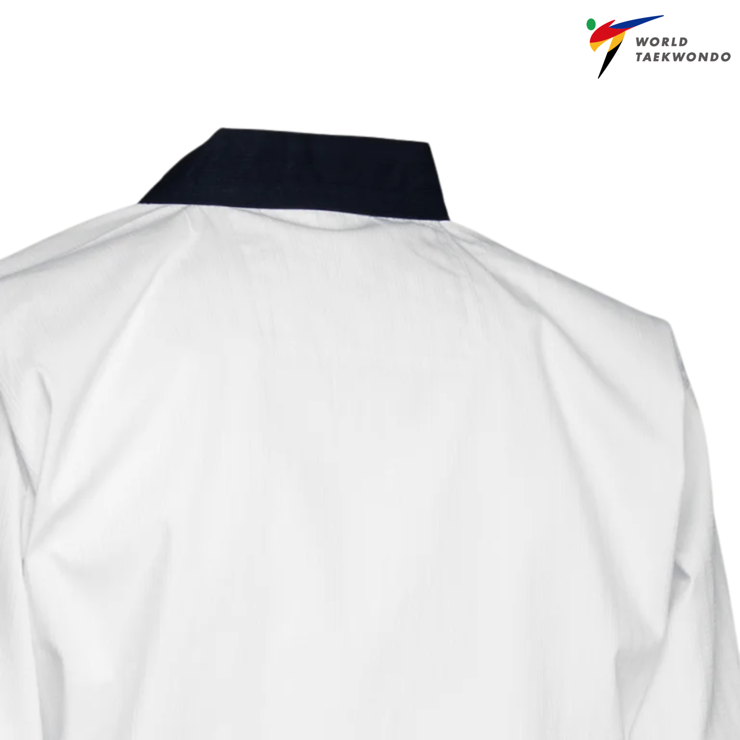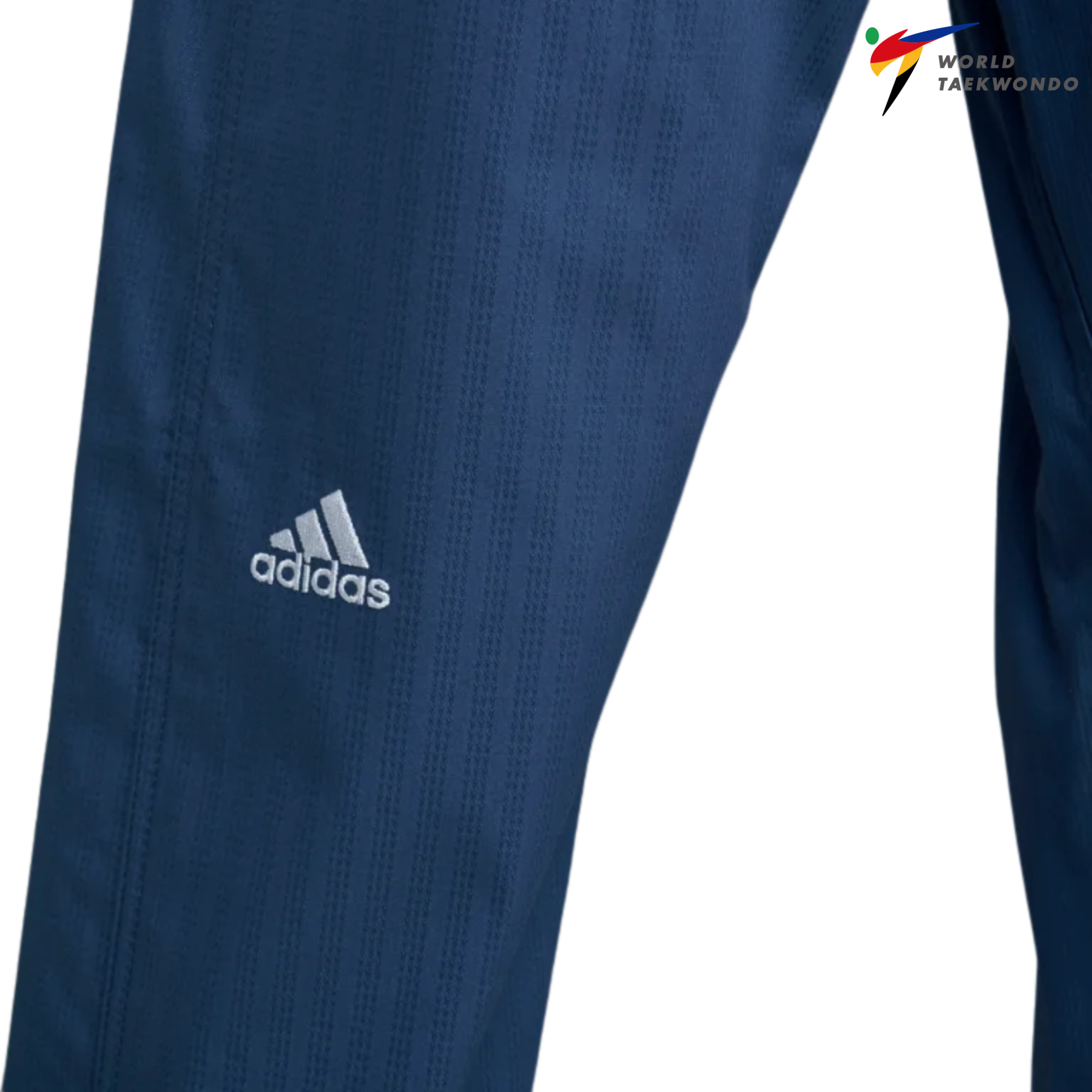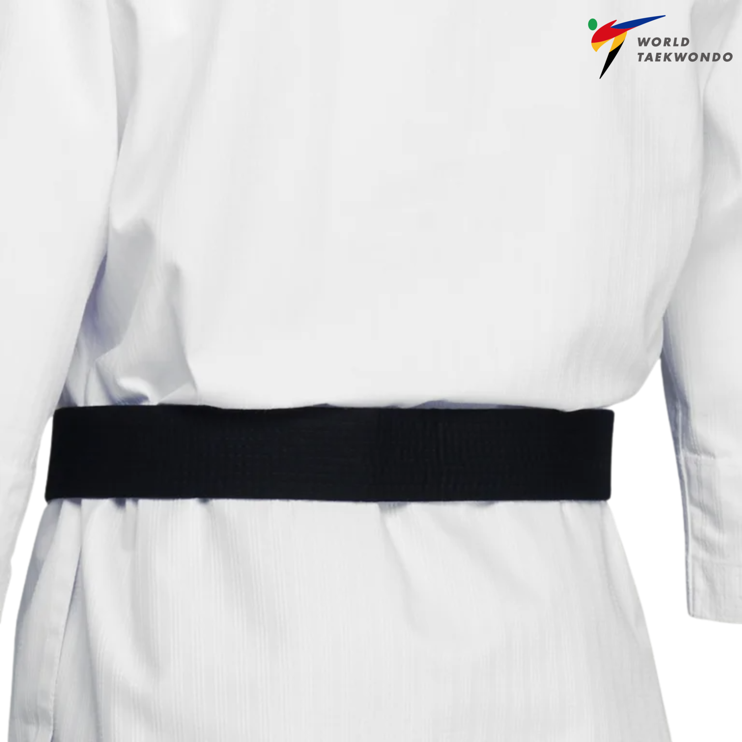 Pakaian Seragam Taekwondo Adidas WT ADI-Poomsae Adult Female diperbuat daripada campuran 55% kapas, 45% poliester untuk ketahanan dan keselesaan. Direka mengikut peraturan rasmi WT, ia menampilkan pakaian seragam leher V hitam dengan bukaan hadapan. Seluar dilengkapi pinggang elastik dan tali serut tambahan untuk kesesuaian yang ketat. Fabrik berstruktur meningkatkan prestasi teknikal, dengan logo sulaman Adidas dan WT menambah sentuhan premium.