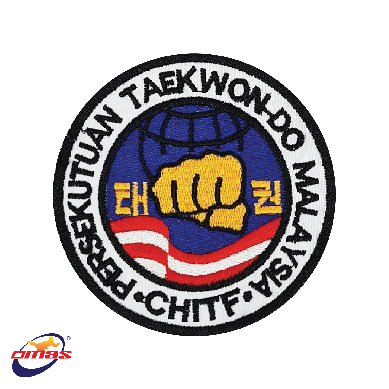 High-quality embroidered Taekwondo logo patch, ideal for martial arts uniforms and apparel.